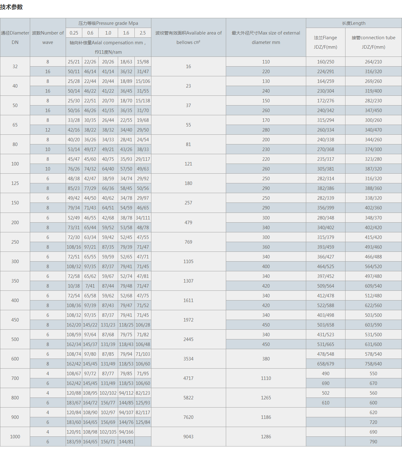 | 通徑Diameter DN | 波數(shù)Number of wave | 壓力等級(jí)Pressure grade Mpa | 波紋管有效面積Available area of bellows c㎡ | 很大外徑尺寸Max size of external diameter mm | 長度Length | |||||