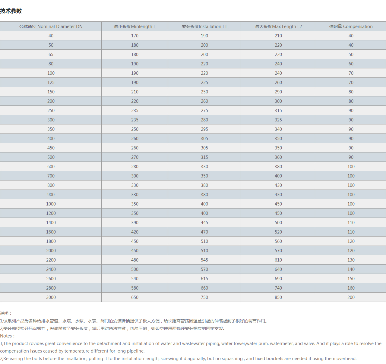 | 公稱通徑 Nominal Diameter DN | 很小長(zhǎng)度Minlength L | 安裝長(zhǎng)度Installation L1 | 很大長(zhǎng)度Max Length L2 | 伸縮量 Compensation |