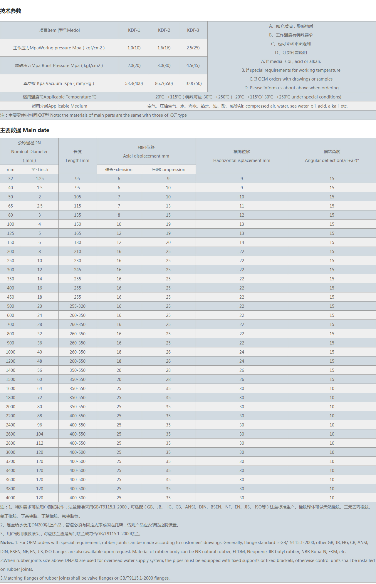 | 注:1、特殊要求可按用戶圖紙制作,可選配(GB、JB、HG、CB、ANSI、DIN、BSEN、NF、EN、JIS、 等)法蘭標準生產(chǎn)。橡膠球體可做天然橡膠、三元乙丙橡膠、氯丁橡膠、丁基橡膠、丁腈橡膠、氟橡膠等。 2、懸空給水使用DN200以上產(chǎn)品,管道必須有固定支撐或固定托架,否則產(chǎn)品應安裝防拉脫裝置。 3、用戶使用橡膠接頭,對應法蘭應是閥門法蘭。 Notes:1. For OEM orders with special requirement, rubber joints can be made according to customers' drawings. Generally, flange standard is , other GB, JB, HG, CB, ANSI, DIN, BSEN, NF, EN, JIS, flanges are also available upon request. Material of rubber body can be NR natural rubber, EPDM, Neoprene, IIR butyl rubber, NBR Buna-N, FKM, etc. 2.When rubber joints size above DN200 are used for overhead water supply system, the pipes must be equipped with fixed supports or fixed brackets, otherwise control units shall be installed on rubber joints. 3.Matching flanges of rubber joints shall be valve flanges or flanges. |