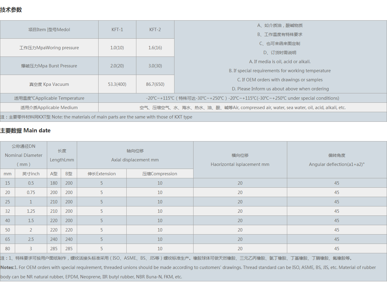 | 注:1、特殊要求可按用戶圖紙制作,螺紋活接頭標(biāo)準(zhǔn)采用(、ASME、BS、JIS等)螺紋標(biāo)準(zhǔn)生產(chǎn)。橡膠球體可做天然橡膠、三元乙丙橡膠、氯丁橡膠、丁基橡膠、丁腈橡膠、氟橡膠等。 Notes:1. For OEM orders with special requirement, threaded unions should be made according to customers' drawings. Thread standard can be , ASME, BS, JIS, etc. Material of rubber body can be NR natural rubber, EPDM, Neoprene, IIR butyl rubber, NBR Buna-N, FKM, etc. |